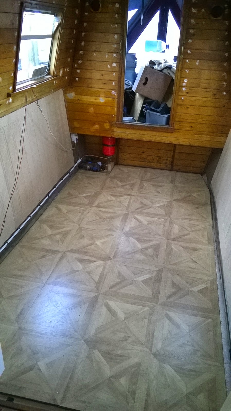 I continued with the lower paneling and that is now complete except for the bedroom. Then came the saloon floor. This was done in 12mm parquet style laminate from B&Q Being wide boards (only 4 across the boat) they were a bit of a trial to get right, but once down I think they look good. There is a bit of a bigger gap at each side than I would have liked but it was unavoidable due to the pattern. Not a big deal, I will just have to fit a wider skirting board.